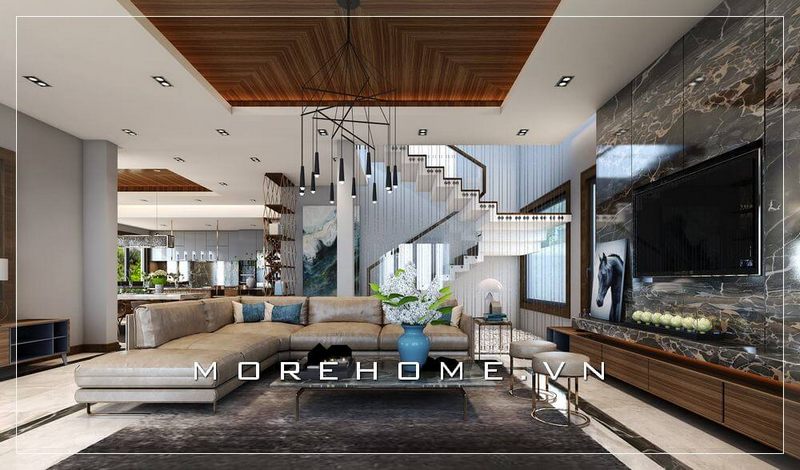. Một mẫu thiết kế phòng khách sang trọng và đẳng cấp cho biệt thự được tạo ra bởi sự kết hợp hài hòa giữa các màu nội thất độc đáo, tạo nên một không gian thu hút.